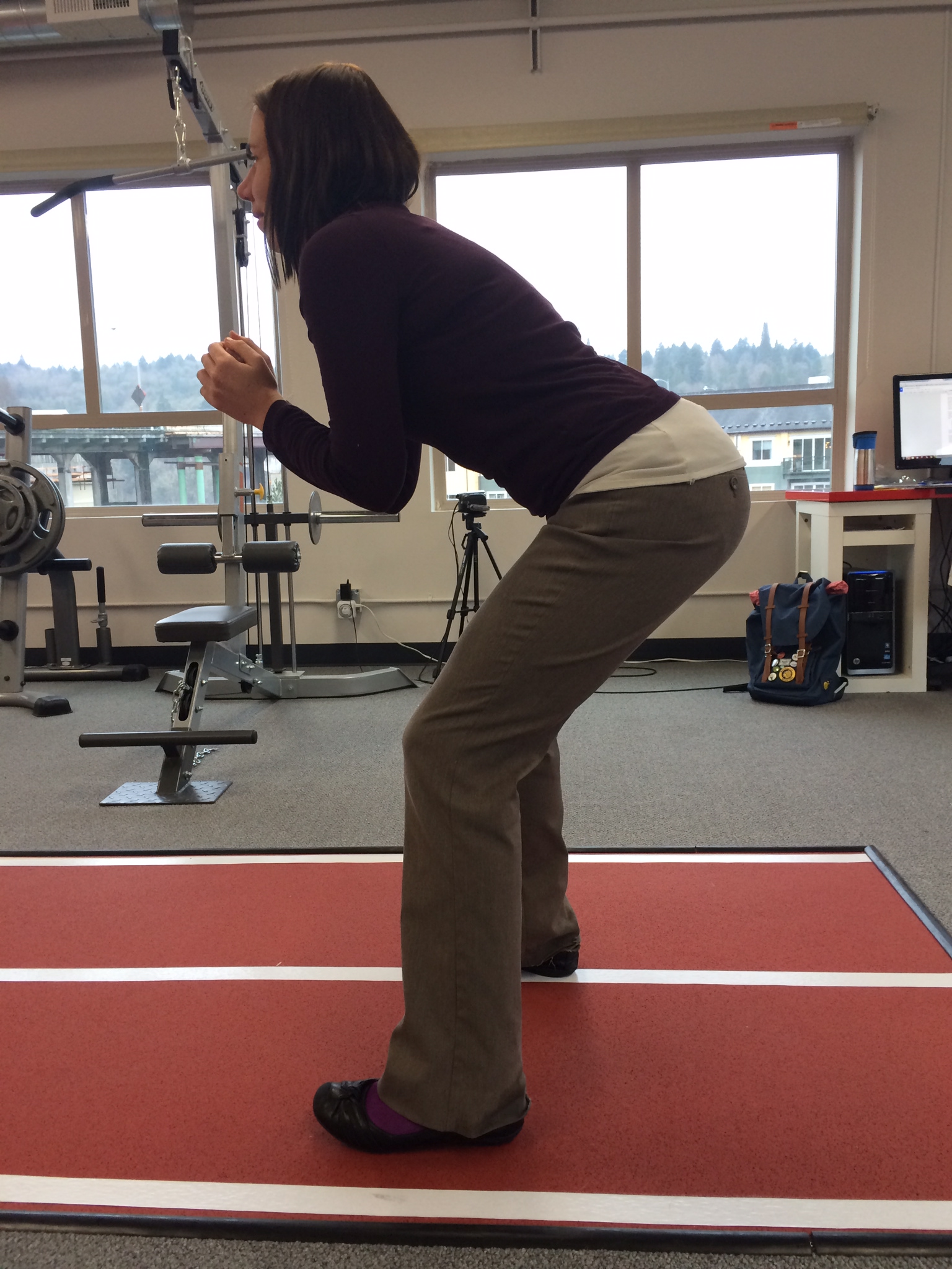 Squats: Squat down as though sitting in a chair behind you. Do not let knees collapse inward, or let knees bend too far in front of you. In the lowest position, knees should be directly over toes.
