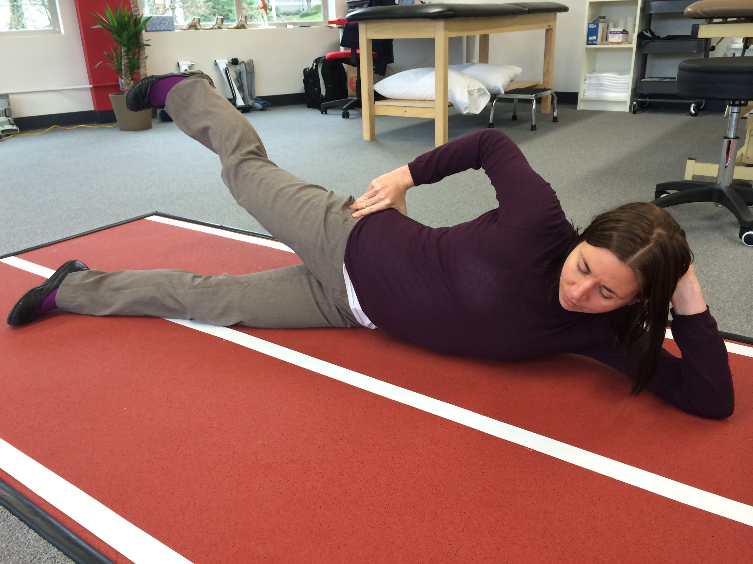 Sidelying Hip Abduction: Done in sidelying position. Keeping top leg straight, kick up and back behind you. You should feel this in the side of your glute. If you feel this in front of hip, be sure to kick leg back further. Complete on both legs.