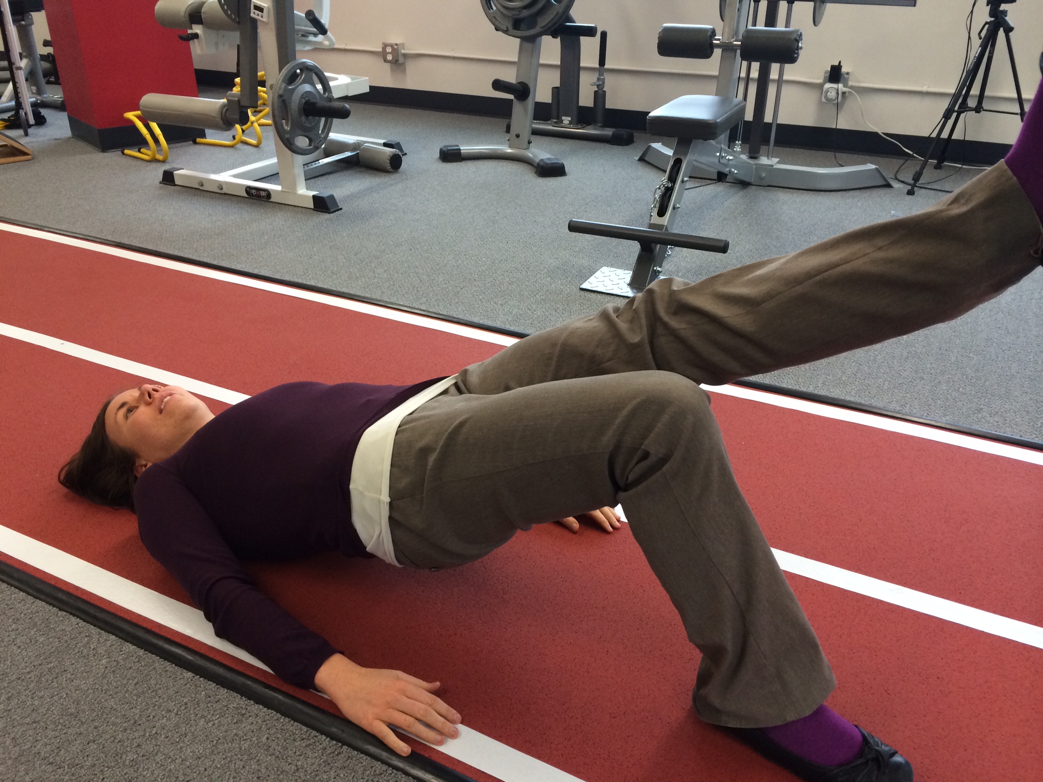 Single Leg Bridge: Squeeze glutes, and bridge hips up, while keeping one leg kicked out. Repetitions should be slow and controlled, and avoid low back arching. Complete exercise on both sides.