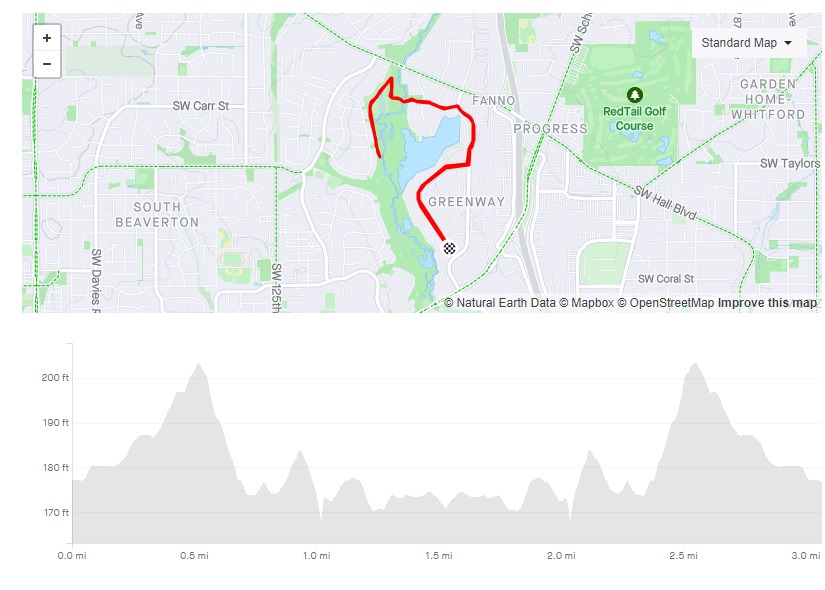 The segment starts at the start line on SW Gemini Drive in Beaverton and follows it to Nimbus, then turns on Stratus before heading into the Greenway. From there, it continues on the paved path before hitting the turnaround and retracing back to the finish.