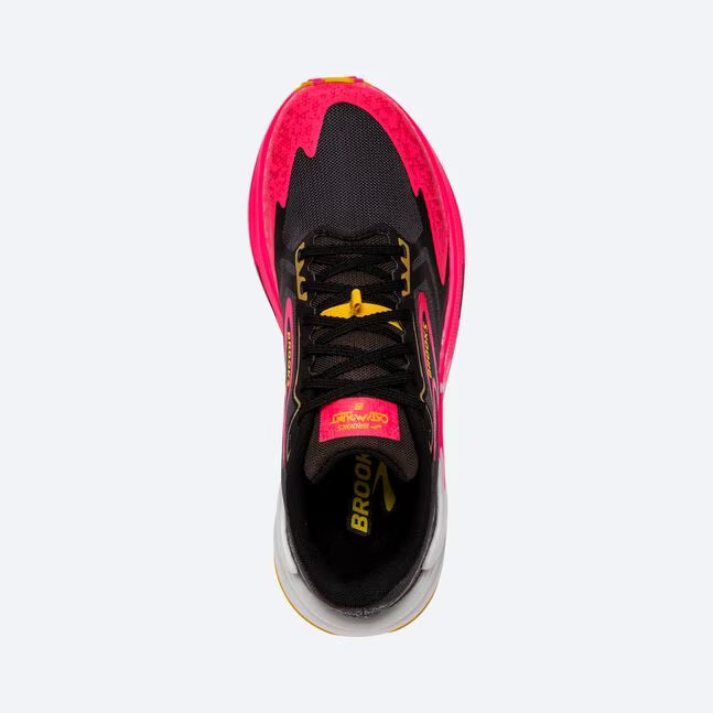 The women’s Brooks Catamount 3 trail running shoes really stand out! I feel like this is the first shoe in a while where the women’s color (Black/Diva Pink/Lemon Chrome) stands out more than the men’s – even though the men’s Lemon Chrome/Sedona Sage color is also somewhat bold.