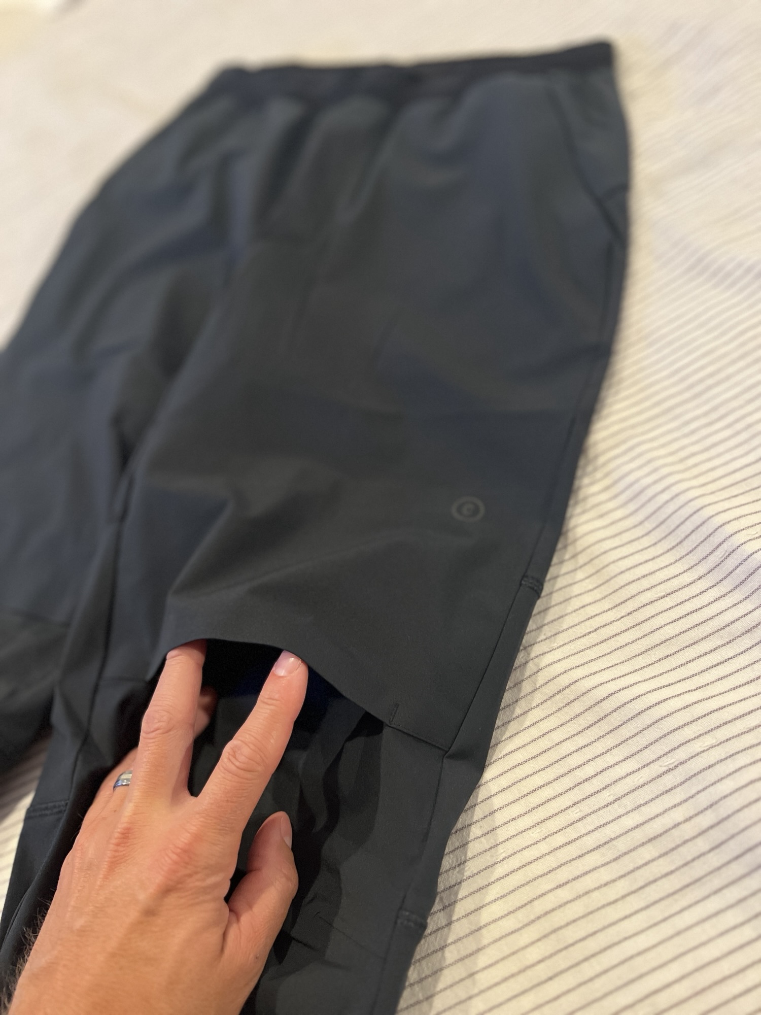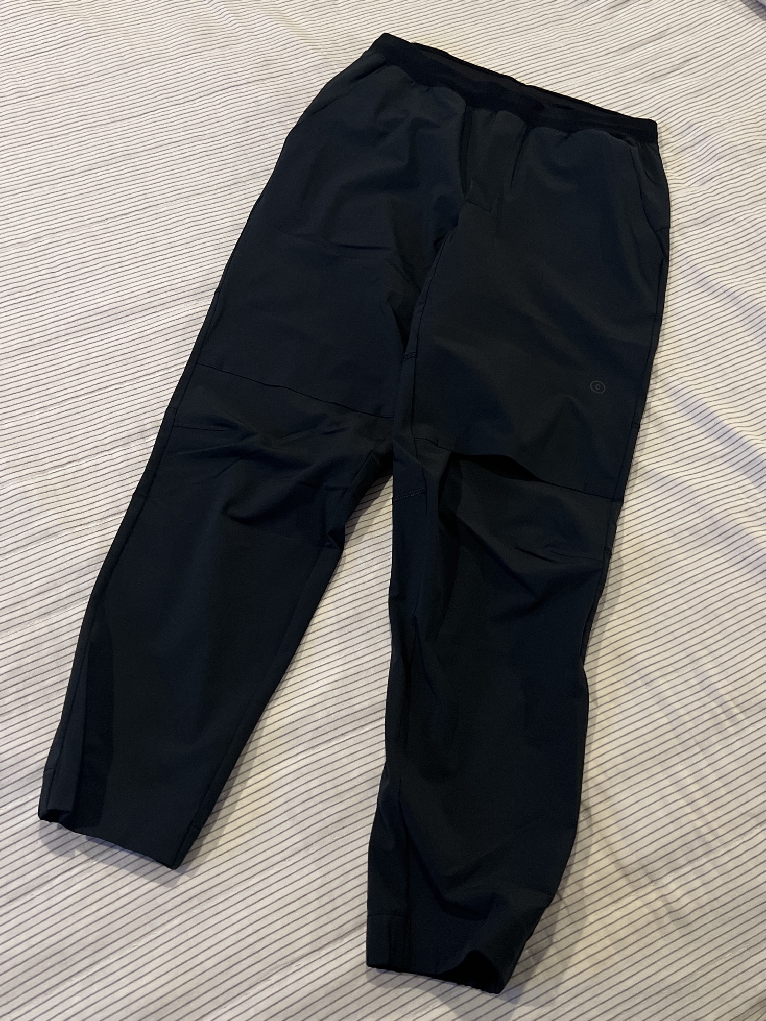 The fit is quite tailored, hugging closer to the body while leaving a bit more room around the thighs and hips. There’s also articulation at the knees, enhancing mobility without compromising the sleek silhouette. One of the standout features is the cropped length, with the pant legs falling just above the ankle—making them perfect to pair with a clean set of white sneakers for a contemporary, polished look.