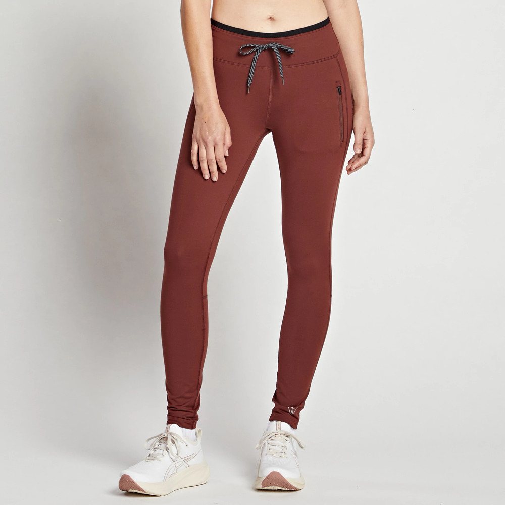 The Glacier Tech Full Length Tights came in the color “teak” which looks like a rich, gorgeous wine hue. These tights have a drawcord through a slim but stretchy elastic waist with the logo name on them. There is one side zipper pocket on the left thigh, and though it’s not quite big enough for some phones, it should hold a car key, a debit card, and/or a gel easily.