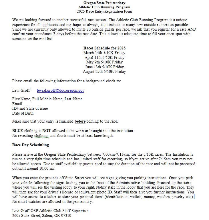 The 2025 Oregon State Penitentiary runs (10k & 5k) are back again on some Fridays starting this Spring!