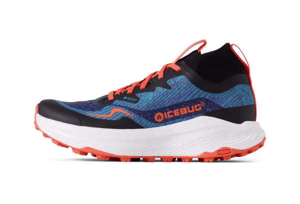 The Jarv is an all-weather, waterproof shoe with a built in gaiter. The GTX stands for GORE-TEX Invisible Fit, and the RB9X refers to the outsole, which Icebug refers to as grippy. Currently, the only colorway is Ice Blue/Orange, but don’t let that stop you.